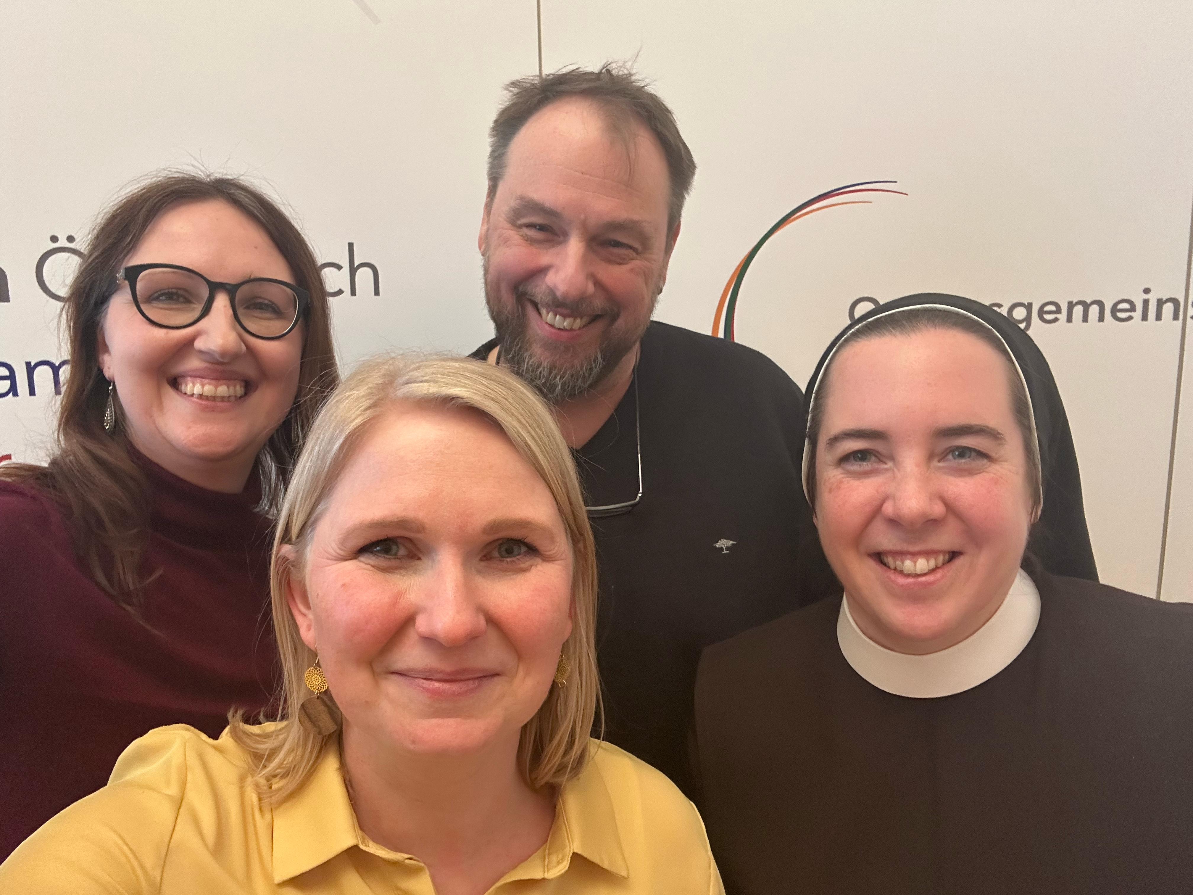 (v.l.): Elisabeth Mayr-Wimmer, Renate Magerl, Robert Sonnleitner und Sr. Helena Fürst geben in der Jubiläumsfolge von „Orden on air“ Einblicke in die bisherigen 49 Podcastfolgen und erzählen, warum es wichtig ist, Ordensleute vor das Mikro zu holen. © ÖOK Fotodownload