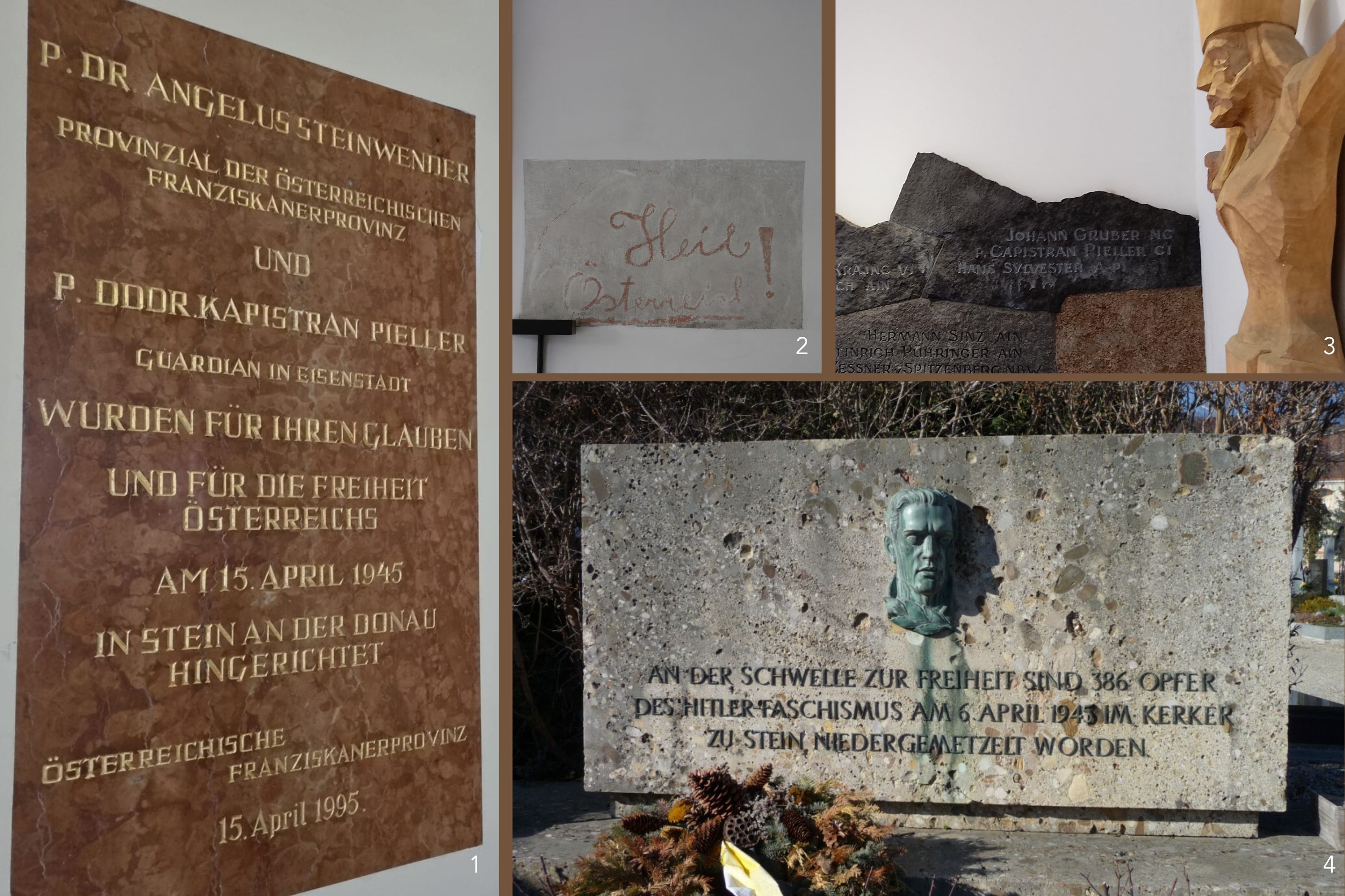 1. Eine Gedenktafel in der Wiener Franziskanerkirche im Eingangsbereich zu der Antoniuskapelle vom 15. April 1995. (c) OFM. Mehr Infos auf Geschichtewiki.wien.gv. 2. Ein Zeichen des Widerstandes: "Heil Österreich" im Salzburger Franziskanerkloster. Dieser Schriftzug überstand die NS-Zeit, obwohl das Kloster von der NSDAP konfisziert wurde und der Gestapo als Zentrale diente. 3. Eine Gedenktafel im ÖCV-Haus in der Wiener Lerchenfelder Straße. (c) ÖCV. 4. Eine Gedenkstein in Stein an der Donau. (c) OFM. Fotocollage zum Download.