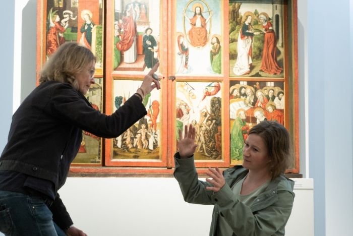 Gesagt, ausprobiert. Zwei Teilnehmende zeigten ihr schauspielerisches Können im „Statuentheater“ und stellten die Szene des Bildes „Elisabeth und Maria“ nach. Dabei mussten sie mitteilen, wie es ihnen in der Pose geht, während auch die anderen Teilnehmenden ihre Beobachtungen dazu teilen konnten. Das Fazit war: Die Gruppe erhielt einen ganz anderen Eindruck, was der Inhalt des Gespräches zwischen Elisabeth und Maria (Tratsch, Abwehr etc.) sein könnte, als jene Intention, die im 15. Jahrhundert von Hans Siebenbürger gemalt wurde.