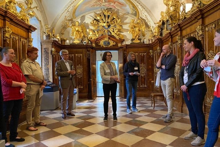 Die Führung machte Halt im Oratorium, einem barock ausgestatteten Raum, der früher von den Ordensmännern des Klosters benutzt wurde. Sogar Kaiserin Maria Theresia soll in diesem noch original ausgestatteten Raum gebetet haben.