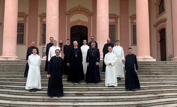 Von 1. bis 6. Mai 2022 fand die Novizenwoche der männlichen Ordensgemeinschaften im Stift Göttweig statt. Am Foto die 11 Novizen mit P. Maximilian Krenn und Propst Petrus Stockinger, die die Novizenwoche leiteten, und Abt Columban Luser vom Stift Göttweig. (c) P. Maximilian Krenn