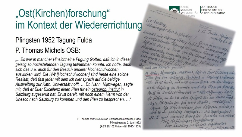 Unmittelbar nach dem Ende des Zweiten Weltkriegs wurden Pläne aufgegriffen, in Salzburg eine katholische Universität zu gründen. Dabei sollte auch die Ostkirchenforschung eine wichtige Rolle spielen. Und dabei wiederum war den Benediktinern eine wesentliche Rolle zugedacht. Ostkirchenforschung sei im deutschsprachigen benediktinischen Umfeld keineswegs fremd gewesen und es sei auch in keiner Weise abwegig erschienen, dass nun auch für die zukünftige Salzburger Universität von Anfang an Ostkirchenforschung mit eingeplant war, erläuterte Winkler; nicht nur, aber auch im Blick auf die Salzburger Bendiktinererzabtei St. Peter. Der Salzburger Erzbischof Andreas Rohracher sei ebenfalls ein engagierter Verfechter dieser Ausrichtung gen Osten gewesen.