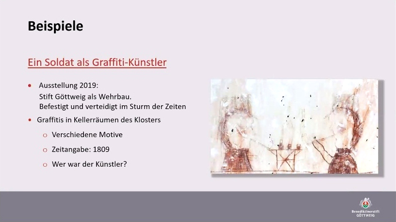 Angelika Kölbl berichtete über Erkenntnisse, die in den vergangenen Jahren im Zusammenhang mit den jährlichen Sonderausstellungen gewonnen wurden. So habe man etwa in einigen Kellerräumen des Klosters Graffiti entdeckt, die aus dem Jahr 1809 stammen dürften. Als "Künstler" komme vor allem ein Soldat der napoleonischen Truppen in Betracht. Die Truppen waren von Mai bis Oktober 1809 im Kloster, "und nun wissen wir, dass sie auch in den Kellerräumen einquartiert waren", so Kölbl. Zu sehen sind beispielsweise Windmühlen, Kirchen und Alltagsszenen von Soldaten. "So wird Geschichte lebendig", berichtete Kölbl. Von den Graffitis wurden Fotos angefertigt und diese in die Sonderausstellung 2019 "Stift Göttweig als Wehrbau" integriert.