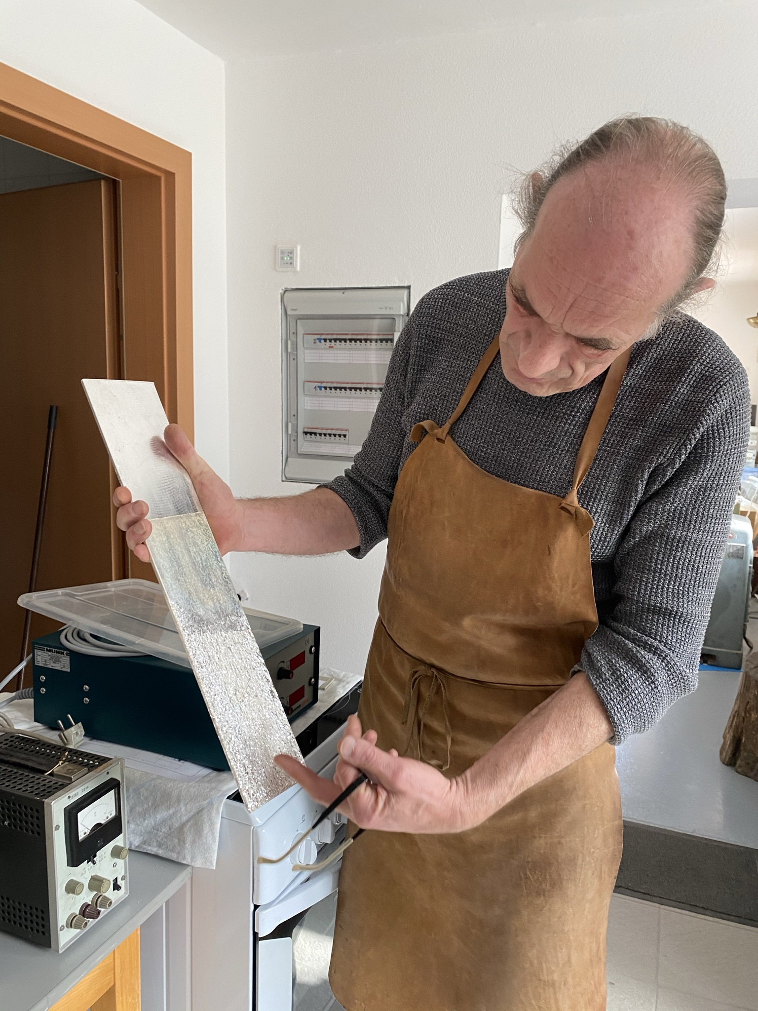 Michael van Ooyen zeigt uns eine galvanisch versilberte Platte. (c) EM