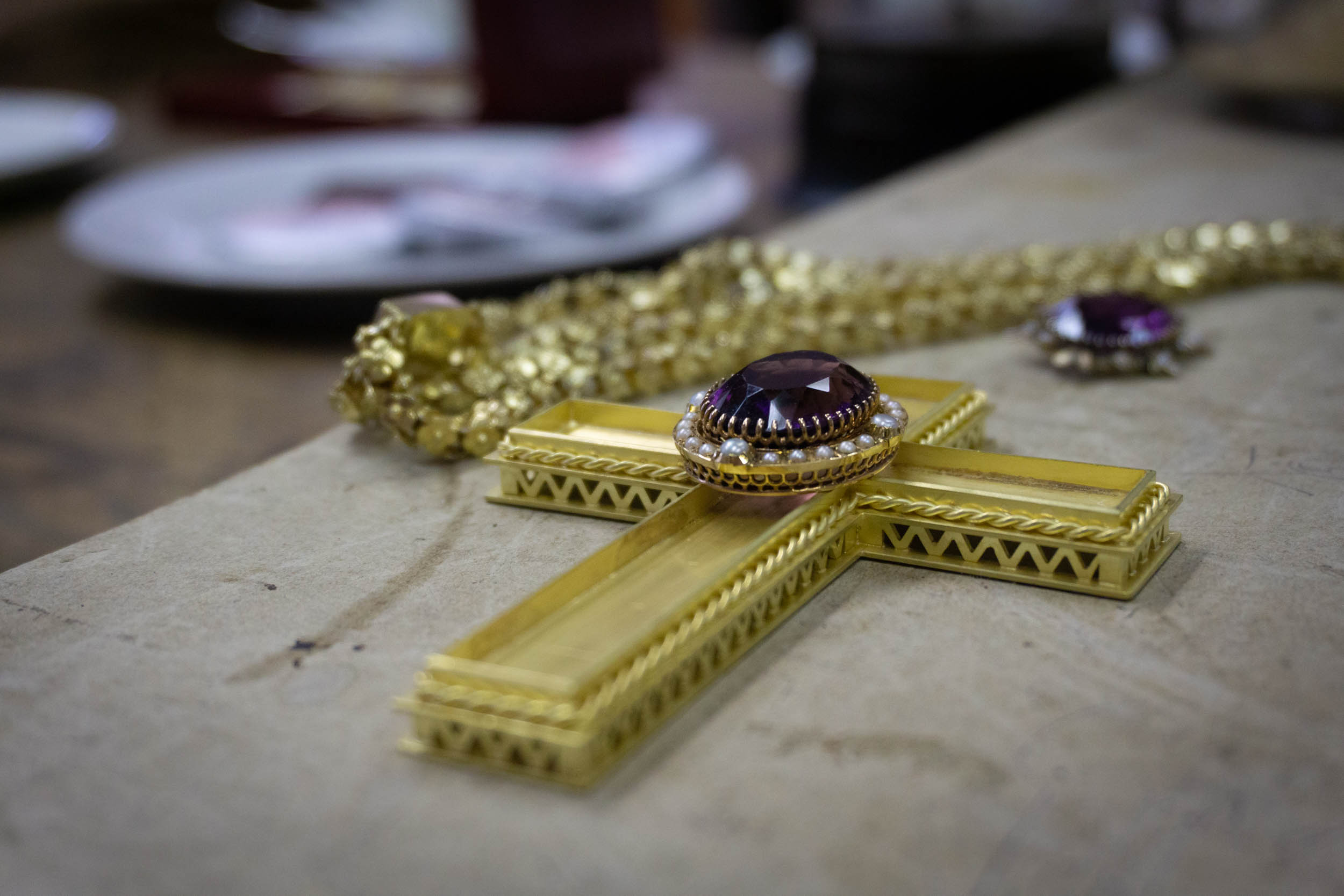 Auf dem Holztisch breitete er eine doppelreihige Goldkette auf, die sich glatt und kühl anfühlte; nicht eine Unebenheit war zu sehen. Daneben ein ca. 10 Zentimeter langes Goldkreuz, deren ausgehölte Leerstellen Michael noch mit Amethysten füllen wird. Die Kette habe er restauriert, das Goldkreuz geschmiedet – eine perfekte Symbiose seiner Tätigkeit von „Neues schaffen und Altes bewahren“.