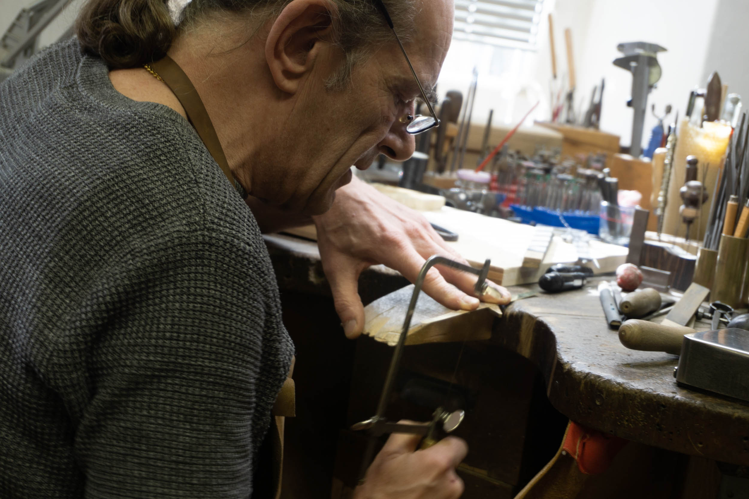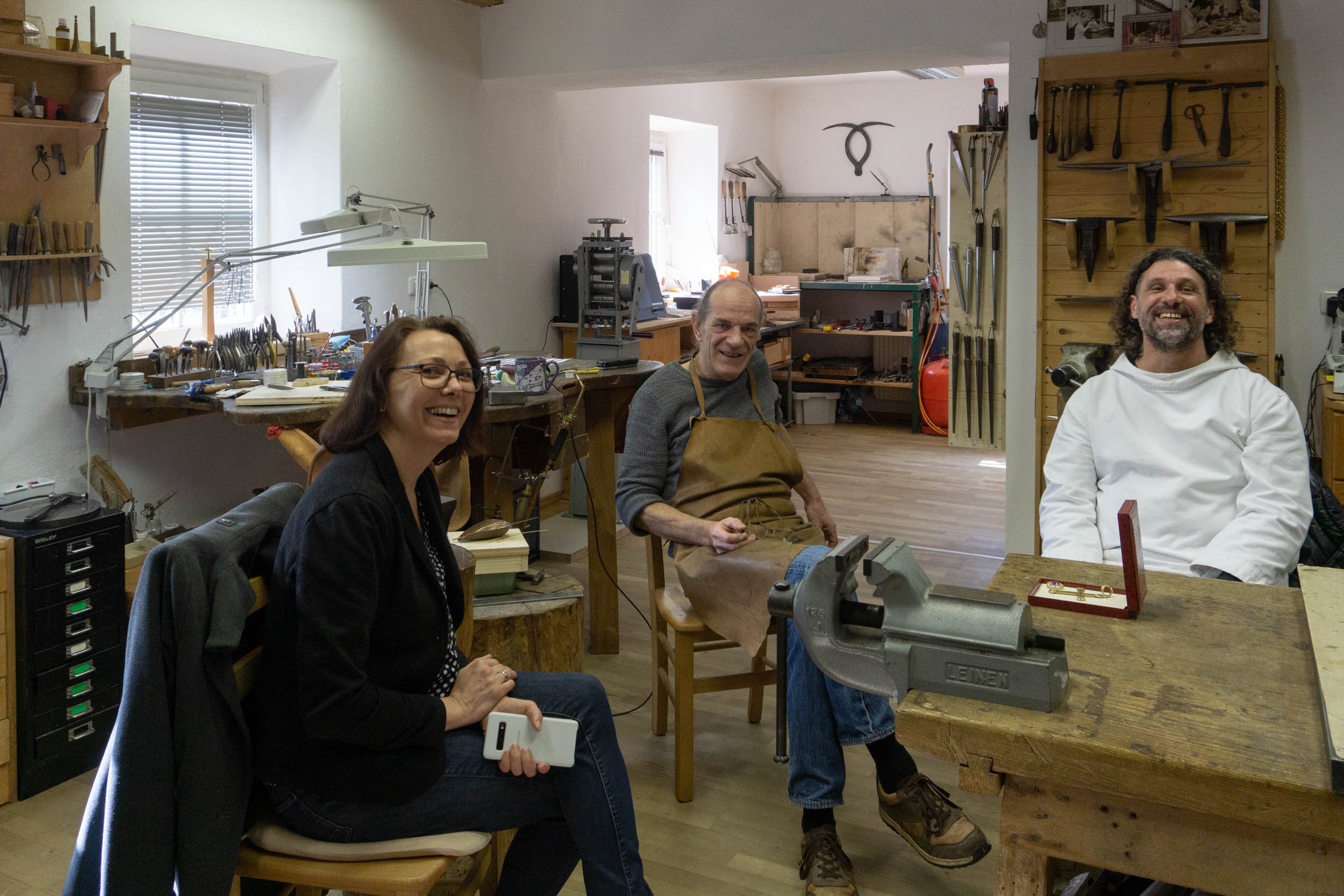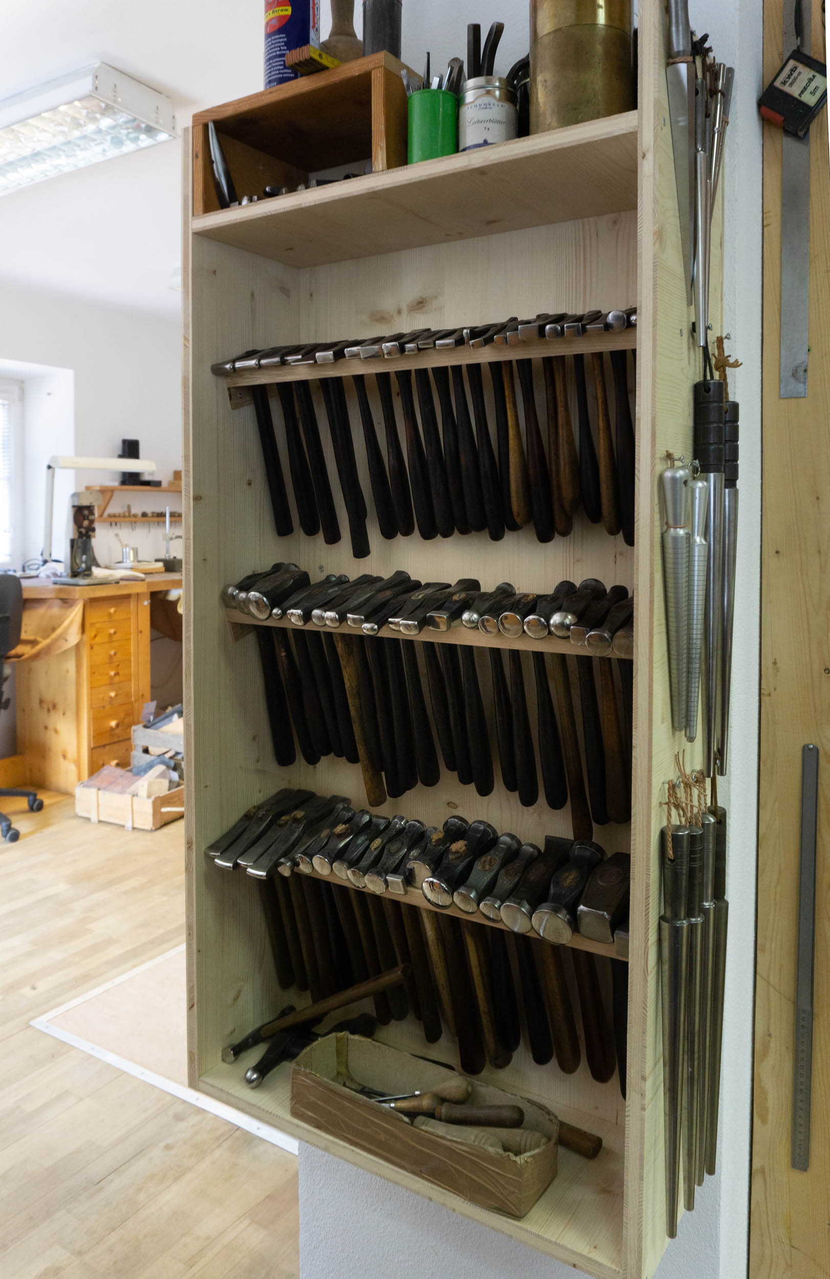 Beim gegenseitigen Austausch erfuhren wir, dass Michael in der dritten Generation Gold- und Silberschmied ist und schon als Kind häufig in der väterlichen Werkstatt anzutreffen war. Der geborene Niederrheiner blickt mittlerweile auf über 45 Jahre Berufserfahrung zurück, die sich auch an der Werkstatteinrichtung widerspiegeln – so manches Werkzeug oder Inventar, das wir dort sehen, wie die über 60 verschieden geformten Hämmer, fand sich schon in der elterlichen Werkstatt.