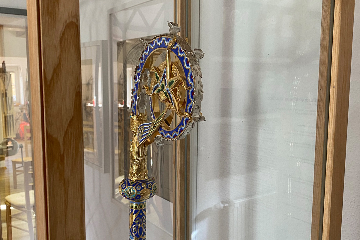Beim Eintreten begrüßte uns der „Wolfgangsstab“, der vor Staub und neugierigen Fingern geschützt in einer Vitrine aufbewahrt wurde und ein beeindruckendes Zeugnis von höchster Schmiedekunst sei, erfuhren wir. Allerdings handelt es sich dabei nicht um das Original aus dem 13. Jahrhundert, sondern um eine qualitätvolle Replik. Aber: „Ein Kirchengoldschmied restauriert und gestaltet, schafft also auch etwas Neues und hat nicht nur mit dem ganzen alten Zeugs zu tun“, verriet Michael augenzwinkernd, bevor er in den Raum links davon abbog, wo schon ein Kaffee auf uns Reisende wartete. Der Kaffeeduft mischte sich mit dem Werkstattgeruch nach Holz, Leim und Metall und wir wussten sofort, hier wird intensiv „gewerkelt“.