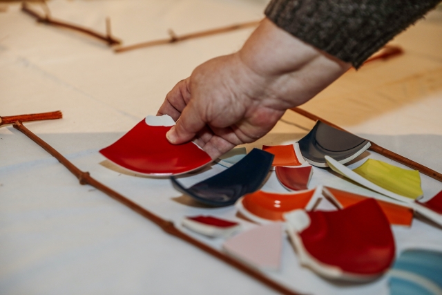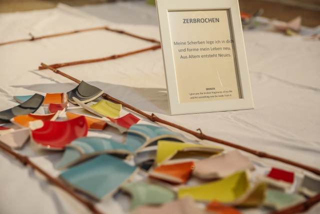 Eine Begegnung mit unseren Erinnerungen zuzulassen kann schmerzhaft und zugleich sehr heilsam sein. „Zerbrochen“ nennt sich eine Station, an der man bunte Scherben in die Form eines großen Kreuzes legen kann. Als Begleittext liest man: „Meine Scherben lege ich in dich und forme mein Leben neu. Aus Altem entsteht Neues.“