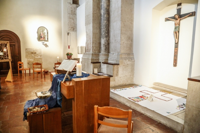 Man betritt die romanische Kapelle, die sich in einen Trauer.Raum gewandelt hat.