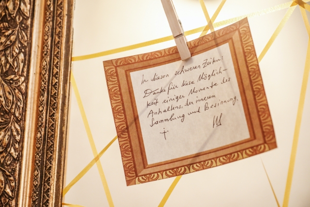 Dass diese Begegnung aber auch etwas Leichtes, etwas Heilendes und etwas Auffangendes haben kann, erlebt man an den verschiedenen Trauerstationen im Trauer.Raum. Indem man seinen Verlust fassbar macht, ihn sozusagen materialisiert, kann man ihn besser greifen, spüren, die eigenen Tränen zulassen und sich danach vielleicht ein wenig leichter fühlen.