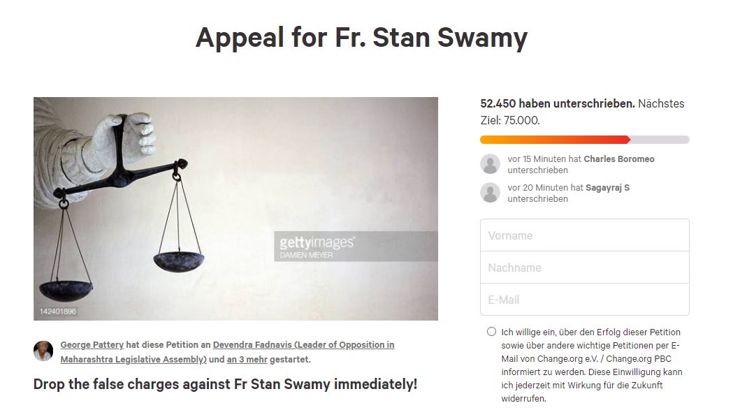 Zum Stand 14.10.2020 befinden sich nahezu 100 Repräsentanten von Menschenrechts- und Basisorganisationen sowie andere Befürworter von Pater Swamy zu seiner Unterstützung im Hungerstreik. Diverse Petitionen zur Freilassung von Pater Swami auf www.change.org hatten zum Stand 14.10.2020 bereits 50.000 Unterschriften.
