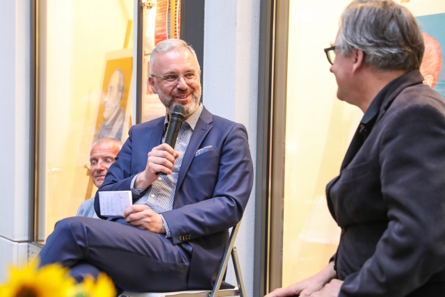 Der Initator der Veranstaltung P. Martin Leitgöb führte das Interview mit Johannes Silberschneider (c) schauer-burkart