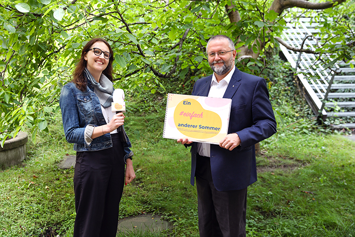 P. Friedrich Prassl SJ, Leiter des Kardinal König Hauses, und Elisabeth Mayr, Medienbüro der Ordensgemeinschaften, im Interview. (c) Schauer