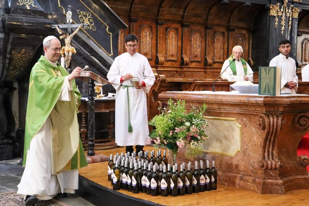 Abt Pius Maurer segnet den Wein, den sein Bruder, der Winzer Friedrich Maurer produziert hat. (c) Stift Lilienfeld