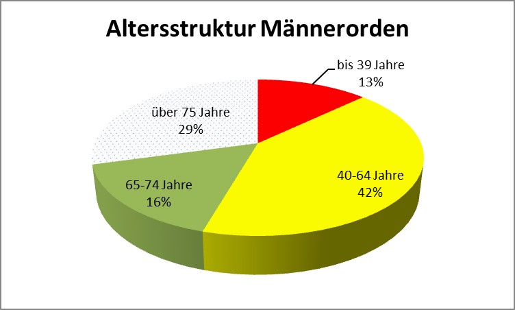 Auffällig bei der Altersstruktur ist, dass bei den Männerorden den größten Anteil (42%) die 40- bis 64-Jährigen ausmachen. Bei den Frauenorden ist der Anteil der 40- bis 64-Jährigen, bzw. 65- bis 74-Jährigen fast gleich groß, um die 18%. Die Männerorden haben zwar im Vergleich zum Jahr 2018 um 14% weniger unter 40-Jährige, aber der Anteil in dieser Altersgruppe ist mit 13% an der Gesamtzahl deutlich höher als bei den Frauenorden mit nur 3%. Bei den Frauenorden ist die Zahl der unter 40-Jährigen im Vergleich zu 2018 konstant geblieben.