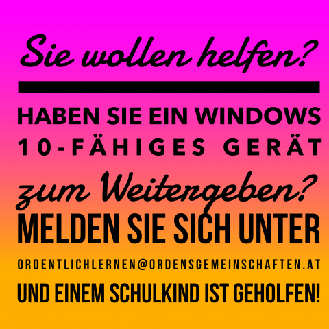 Bitte helfen auch Sie: Jede Spende zählt!Wenn Sie ein Windows10-fähiges Gerät zu Hause haben, melden Sie sich bitte unter ordentlichlernen@ordensgemeinschaften.at, um einem weiteren Kind das Homeschooling zu ermöglichen! |
