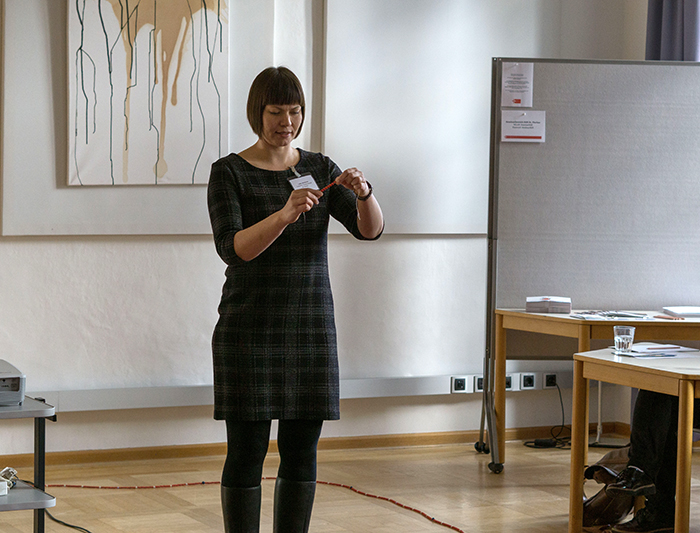 Wie man Kindern und Jugendlichen Kunst vermitteln kann stellte Lydia Zachbauer vom Stift St. Florian im nächsten Vortrag vor. Ausgestattet mit Zepter und Schleife nahm sie die Anwesenden mit auf eine Führung durch das Stift. Beide Utensilien braucht sie für die „Habsburger-Familienaufstellung“, bei der die Kinder spielerisch den Stammbaum der Habsburger kennenlernen. In der Vermittlung setzt sie viel auf das „Erleben“: „Kinder wollen Dinge erfahren und angreifen. Und: Unser Vorteil ist, dass das Stift voll von Dingen ist, die man im Klassenzimmer nicht hat.“ Die Gruft mit den Gebeinen etwa, die bei den Kindern immer auf großes Interesse stößt, oder die Säle des Stiftes, wo Menuett getanzt wird. „Wir wollen nicht vortragen. Wir wollen, dass die Kinder selber durch Fragen auf die Lösung kommen“. Die Führungen dauern daher auch immer mindestens 90 Minuten, weniger macht, ihrer Erfahrung nach, keinen Sinn. Ihr Fazit: Es lohnt sich, Kindern und Jugendlichen Raum zu geben, das Stift und seine Schätze im eigenen Tempo zu entdecken und dabei auch die Interessen der jungen Zielgruppe im Auge zu behalten.