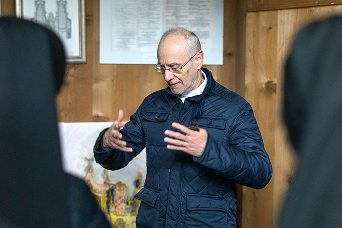 Der Tag begann mit einer Führung durch das Stift. Gemeinsam ging man zuerst „auf die Orgel“, gemeint ist berühmte Bruckner-Orgel des Stiftes – benannt nach Anton Bruckner, der während seiner Arbeit als Linzer Domorganist darauf spielte. Nach einer kurzen Vorstellung der Funktionsweise und Klänge der Orgel wurden die TeilnehmerInnen hinter die Orgel – in den „Technikraum“ – geführt. Spannend zu sehen war, wie groß die Orgelpfeifen von der Nähe aus betrachtet tatsächlich sind sowie mit welch simpler Komplexität eine Orgel aufgebaut ist. Danach öffnete Herr Harald den Gästen die Tür ins Sommerrefektorium, das von Baumeister Jakob Prandtauer gestaltet wurde. Den Schluss markierte die beeindruckende Stiftbibliothek, die mit mehr als 150.000 Beständen aufwartet.