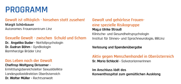 Die Teilnahme ist kostenlos, keine Anmeldung ist erforderlich und zahlreiche Gäste sind erwünscht.Am Programm stehen Vorträge von Margit Schönbauer (Autonomes Frauenzentrum Linz), Notfallpsychologin Angelika Bruder, Gynäkologin Grudrun Böhm, Chefispektor Wolfgang Dirisamer (Landespolizeidirektion OÖ), Rechtsanwalt Walter Müller, Psychologin Ulrike Strauß und Sr. Maria Schlackl von den Salvatorianerinnen.
