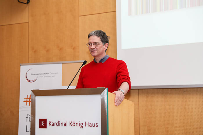 Leo Zogmeyer, Bildender Künstler, Maler, Grafiker, gestaltet Kunst im öffentlichen Raum, vor allem aber liturgischer Räume. Er stellt in seinem Vortrag die Frage, was eigentlich Reduktion sei. Für ihn gehe es im Wesentlichen um die Reduktion von Bildern, damit „uns die Bilder, die Modelle, die Muster nicht zu sehr übernehmen“. Wir können ja die Wirklichkeit als solches nicht reduzieren. Weniger ist mehr sei ein weiser Satz. Ein Weniger an Bild kann ein Mehr an Realität bedeuten. Auch weil es in der Bibel heißt: Du sollst dir kein Bildnis machen.