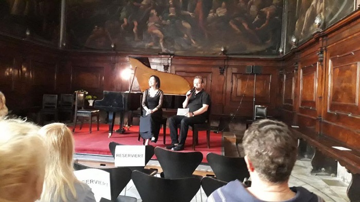 Wandel sei immer mit einer gewissen Unsicherheit und Ungewissheit verbunden. Das sei auch der Grund, warum die Ordensfrau/Pianistin für ihr Programm unter anderem zwei Stücke ausgewählt habe, die sozusagen aus dem Hause Schumann stammen. Clara Schumann musste durch die Krankheit und den Tod ihres Mannes Robert einigen Veränderungen gegenüberstehen; in einem Tagebucheintrag, den Joanna Jimin Lee vorlas, formulierte sie ausführlich ihre Sorgen. Dennoch musste das Leben weitergehen. „Loslassen befreit“ – und Clara Schumann musste ihr altes Leben loslassen und ein – ihr – neues Leben beginnen. Sie blieb bis an ihr Lebensende fürsorgliche Nachlassverwalterin ihres Mannes, vor allem aber selbst auch gefeierte Komponistin und Klaviervirtuosin.