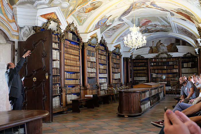 Herr Michael Hammer Can.Reg. (Bibliothekar in Stift Reichersberg) und HR Dr. Paulus Wall (ehem. Referatsleiter der Direktion Kultur des Landes OÖ) berichteten anschaulich über das geplante Projekt, bestandserhaltende Maßnahmen in der historischen Stiftsbibliothek in Reichersberg durchzuführen. Sie befinden sich noch am Anfang des Projektes und planen zurzeit den Ablauf der vorzunehmenden Schritte. Bevor der eigentliche Bücherbestand von über 20.000 Bücher gereinigt werden kann, ist zuerst der allgemeine bauliche Zustand des Raumes zu überprüfen. Erst danach können weitere Schritte gesetzt werden. Das Vorhaben wird vom Bundesdenkmalamt begleitet und bei den Restaurierungsarbeiten fachliche Restauratoren hinzugezogen. Eine digitale Katalogisierung des gesamten Bücherbestandes wäre ein wünschenswerter Abschluss des Projektes.