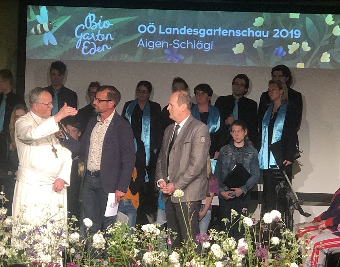 Als Eröffnungsfestredner war Prior P. Johannes Pausch vom Europakloster Gut Aich geladen. Launig hat er gleich am Beginn seiner Ausführungen den Eröffnungsgästen zugesagt: "Das Paradies hat einen Ort: Aigen-Schlägl." Pausch nimmt die Aktivitäten der Fertigstellung als Bild und frage: "Wie können wir die Kurve zur Ruhe schaffen? Lassen wir uns anrühren vom Garten und den Menschen, die hier Paradies-Menschen sind. Denn wer einen Garten anlegt, tut etwas Göttliches. Der Garten kann noch so klein sein, er ist immer sehr hoch, ein Blick in den Himmel. Das Paradies beginnt immer am Boden, ja oftmals auf einem Misthaufen." Pausch spricht die verwandelnde Kraft der Natur und eines Gartens an: "Geist und Herz können etwas - auch einen Misthaufen - neu in Beziehung und zum Blühen bringen. So eine Landesausstellung kann eine Schule des Lebens sein. Beispielsweise sind Heilpflanzen fast ausschließlich als Migranten aus anderen Ländern und Kontinenten zu uns gekommen und wir haben sie in unsere Kultur integriert. Ein schöner Prozess des BioGartenEden." Genauso warnt der Kräuterexperte davor, "nicht gleich jedes unbekannte Kraut, das als Unkraut gesehen wird, auszureißen. Denn so manches Unkraut wurde als Heilkraut wieder entdeckt." Pausch ist überzeugt und ermutigt die Menschen, nach Aigen-Schlägl zu schauen: "Schaut nach Aigen-Schlägl. Da ist ein Fenster ins Paradies geöffnet worden. Da erfüllt uns nach so einem Besuch mit großer Dankbarkeit, die durch alle Dimensionen des Lebens flutet."