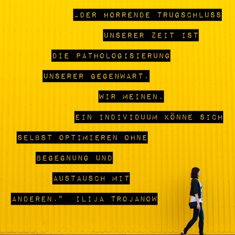 Die beste Form einer wachen Kooperation findet Ilija Trojanow in solidarischem Miteinander, also in gegenseitiger Hilfe und Wissensaustausch. Der bestmögliche Zusammenschluss sei einer von Menschen, die einen gemeinsamen Rahmen an Überzeugungen, Idealen, Aufbrüchen und Sehnsüchten teilen. „Der horrende Trugschluss unserer Zeit ist die Pathologisierung unserer Gegenwart. Wir meinen, ein Individuum könne sich selbst optimieren ohne Begegnung und Austausch mit anderen. Das ist krankhaft“, bringt es der Autor auf den Punkt.