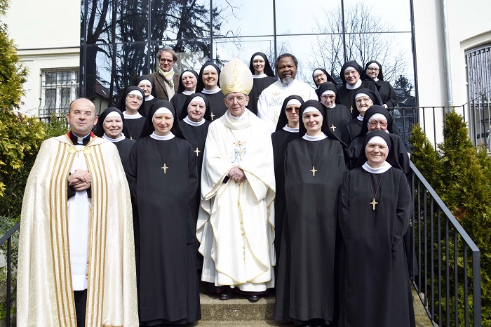 Bischof Küng mit der Gemeinschaft, mitfeiernden Priestern und dem Architekten. Foto: Benediktinerinnen der Anbetung