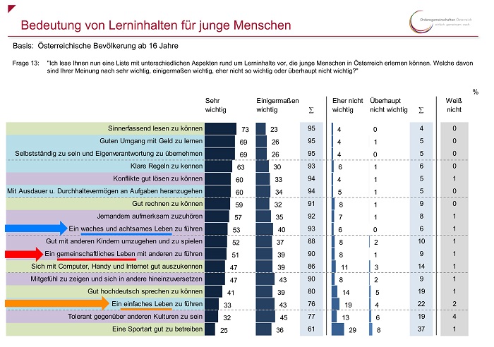 „Überrascht hat mich, dass „Sinnerfassend lesen“ und „Guter Umgang mit Geld“ so weit vorne liegen. Beides macht allerdings den jungen Menschen heute fähig, eigenverantwortlich und selbstständig zu sein. Kann und hat er beides nicht, ist das mit Benachteiligung verbunden.“ Der Vater und Ordensschul-Leiter der HAK-Lambach Stefan Leitner sieht im Geld ein wichtiges Mittel für Lebenssouveränität: „Bei uns in der Schule ist Geld verwalten immer ein Thema. Uns ist es wichtig, dass die Schülerinnen und Schüler einen nachhaltigen Umgang lernen. Eine unserer Botschaften ist, dass man sich mit Geld nicht freikaufen kann von Verantwortung. Es geht darum, das Geld gut einzusetzen.“ Leitner weiß aus eigener Erfahrung, dass junge Leute auf einmal in der Schule sagen, sie wollen nicht mehr lernen, sondern Geld verdienen: „Sie sagen: Ich will Geld verdienen, selbstständig sein.“ Sie machen eine Lehre und hören mit der Schule auf. Lehrbetriebe ziehen Jugendliche mit Geld und Benefits an, weil es auch heute weniger Nachwuchs gibt. 69% bzw. 59% der Bevölkerung raten sozusagen zu diesem Schritt im Umgang mit dem Geld.