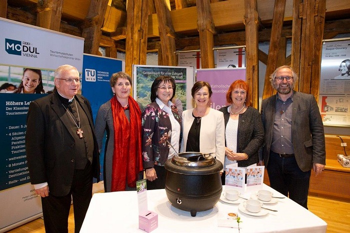 Wie das die kfbö unter anderem tut, präsentierten kfbö-Vorsitzende Veronika Pernsteiner und ihre Stellvertreterin Petra Unterberger anhand der Projektpartnerschaft mit „WODSTA“ (Women Development for Science and Technology), einer Frauenorganisation in Tansania, die mit kfbö-Unterstützung eine ökonomische, ökologische und soziale Alternative für Frauen bietet: Frauen entwickeln technologische Lösungen, um angesichts knapper Energieressourcen ihren Haushalt, insbesondere das Kochen, ökologisch verantwortet zu bewältigen. Sie bauen und verkaufen Energiesparöfen und schonen damit nicht nur die Umwelt, sondern verbessern auch ihre ökonomische und soziale Position: „Diese Frauen haben den ´Wandel gewagt´, sie sind tätig geworden, ´gemeinsam für eine Zukunft aus eigener Kraft´“, so Veronika Pernsteiner im Rekurs auf Themenschwerpunkt und Slogan der Aktion Familienfasttag in der heurigen Fastenzeit. Das bedeute auch ein anderes Verständnis von „Fortschritt“, erklärte die zweite Festrednerin des Abends, die Schauspielerin Stefanie Dvorak: „Es geht hier um einen Fortschritt, den die Frauen selbst vorantreiben, ohne dass wir - die Nachfahren ehemaliger Kolonialmächte – sagen, wie es geht und uns daran bereichern“. Militärbischof Bischof Werner Freistetter, in der österreichischen Bischofskonferenz zuständig für Weltkirche, knüpfte in seinem Grußwort an die Forderung nach ökologischem, ökonomischem und sozialem Strukturwandel an: die heuer bevorstehende Amazonien-Synode greife diese Dimensionen auf, sie soll als „Zeichen für die Welt“ „neue Wege“ des Miteinanders auftun, etwa im Blick auf eine „interkulturelle Spiritualität“. In einer Zeit, in der immer mehr „Grenzen gezogen“ würden, sei es dringend notwendig, „Grenzen zu überwinden“. Bischof Freistetter dankte der Katholischen Frauenbewegung Österreichs für ihr unermüdliches Engagement dafür, „die Stimmen von Frauen“ hörbar zu machen. Anlässlich des diesjährigen Benefizsuppenessens hat das die kfbö gemeinsam mit der Vizerektorin der Technischen Universität Wien, Anna Steiger, getan, die als Gastgeberin des Abends in ihrem Grußwort auf die vielfältige Unterstützung von Frauenprojekten durch die TU hinwies: „Frauen nutzen Technik und Innovation, um das Leben für sich und ihr Umfeld nachhaltig zu verbessern. Darum unterstützen wir das Projekt der Katholischen Frauenbewegung, das Frauen zu einem selbst bestimmten Leben verhilft“, so Steiger. Auch die TU hat heuer Anlass, den Blick ganz besonders auf Frauen zu richten: sie feiert 2019 „100 Jahre Frauenstudium“.