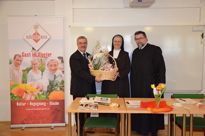 Die Präsidentin Sr. Michaela Pfeiffer-Vogl überreichte dem bisherigen Geschäftsführer von Klösterreich, Hermann Paschinger (links), zum Dank für seine bisherige Tätigkeit einen Geschenkkorb. Rechts im Bild ist P. Michael Hüttl, Prior von Stift Altenburg und Kassier des Vereins Klösterreich. Neuer Geschäftsführer des Vereins ist Manuel Lampe. Foto: Klösterreich