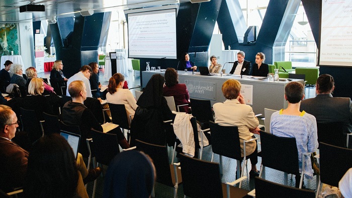 Unter dem Titel „Betroffene von Menschenhandel – Unsichtbar oder TrägerInnen von Recht?“ beschäftigte sich der Vormittag mit den verschiedenen Formen der Ausbeutung im Kontext von Menschenhandel und zeigte Indikatoren auf, die auf Ausbeutung hinweisen können, sowie die Möglichkeiten der „Identifizierung“. VertreterInnen von NGOs, die sich auf den Rechtsbeistand von Betroffenen spezialisiert haben, berichteten aus der Praxis, darunter Sr. Anna Mayrhofer von SOLWODI Österreich. Der von sechs weiblichen Ordensgemeinschaften gegründete Verein finanziert und betreut eine Schutzwohnung für Frauen in Wien.