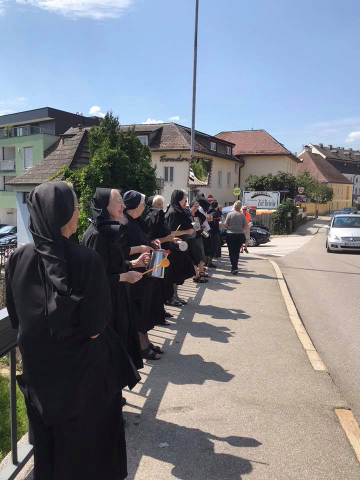 Auch die Franziskanerinnen von Vöcklabruck beteiligten sich geschlossen an dem Flashmob und lenkten die Aufmerksamkeit von Passanten und Autofahrern auf das Anliegen. Das Teilen von Bildern und der Geschichte im Social Web via Facebook erzeugt ebenfalls ein Echo.