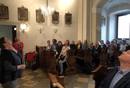 Helga Penz vom Kulturreferat der Orden und Sr. Ruth Pucher von der Ordensentwicklung stellten anhand der Piaristenkirche und der Mary Ward Klosterkirche in Krems den KlausurteilnehmerInnen die Chancen einer guten Kirchenpädagogik vor. Mit dem „genauer hinschauen kann das Profil geschärft werden“. Beide betonen, „dass gerade in den Kirchen und Kapellen das Charakteristikum einer Ordensgründung sichtbar wird und sich das jeweilige Ordenscharisma in der Ausgestaltung niederschlägt“. Es geht schlicht darum, „das zu erschließen, was da ist“.