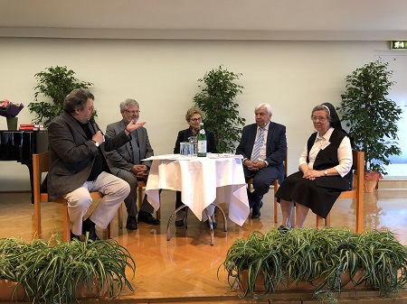 Die Podiumsdiskussion: vlnr. Rudolf Luftensteiner, Bildungsreferat, Franz Asanger, Direktor Schulamt Linz, Eva Maria Vogel, ehem. Direktorin Ursulinengymnasium, Johann Heuras, Bildungsdirektor Niederösterreich, Sr. Beatix Mayrhofer, Präsidentin Vereinigung der Frauenorden Österreichs