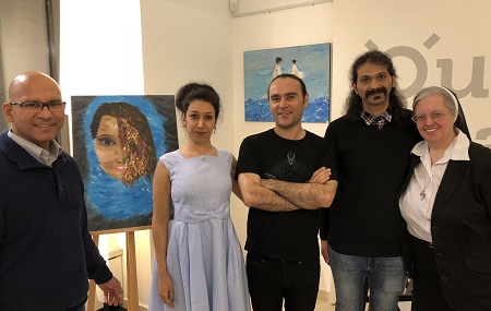 vlnr: P. Alberto de Marques de Sousa (Kamilianer), Samira Ghaemi (hat Englisch im Iran studiert, Malerin), Mahdi Osati (Tontechniker aus Teheran, Maler und Musiker), Mohammad Maleki (Maler, Fotograph und Musiker aus dem Iran), Sr. Johanna Kobale