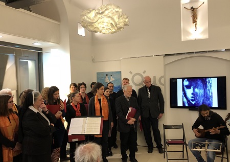 2015 hat P. Alberto de Marques de Sousa (Kamilianer) die Künstlerin Samira Ghaemi, den Maler Mohammad Maleki und den Tontechniker Mahdi Osati im Flüchtlingscamp Lainz kennengelernt. Sehr bald haben er und Sr. Johanna Kobale ein helfendes Netz gespannt und mit ihnen künstlerisch zu arbeiten begonnen, „denn es ist immer besser, den Kopf mit Musik und Kunst zu füllen als mit Angst und Hoffnungslosigkeit“. Sr. Kobale hat stundenlang mit ihnen geprobt und gesungen. Im Iran ist das Singen verboten und so wurde „das mehrstimmige Singen eine völlig neue Erfahrung“. Bei der Vernissage wurden Kostproben des Könnens geboten.