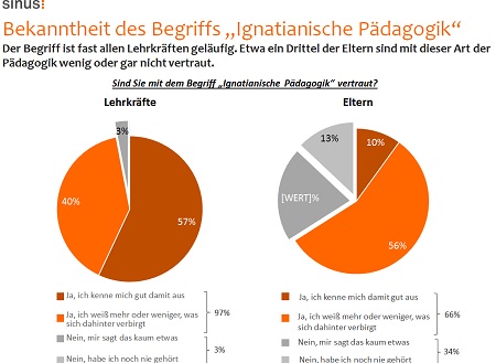 Der Begriff „Ignatianische Pädagogik“, geprägt aus der Jesuiten-Spiritualität, ist 97% der Lehrkräfte und 66% der Eltern sehr gut oder gut vertraut. Dieser Frageblock hatte die Wertevermittlung im Fokus. Zentrale Ansprüche werden so formuliert: Erziehung zu Selbstbewusstsein wird vor allem in Richtung „Anforderungen des Lebens als Chance begreifen“, „nicht einfach beim Gewohnten stehen bleiben“ und „Fehler machen dürfen“ gesehen. Religiöse Erziehung wird „Auf Gott vertrauen“, „Gott in allen Dingen finden“ und „Orientierung an Jesus und seine Botschaft“ hin gedeutet. „Ignatianische Pädagogik wird vor allem dorthin zusammengefasst: Die Frage nach Gott wachhalten“, resümiert Direktorin Pichler die Auswertung.