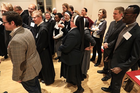 Schon ab 9.30 Uhr tagt die gemeinsame Leitung von Frauen- und Männerorden. Nach einer Stunde geht es in den Vorstand der Superiorenkonferenz und in das Präsidium der Frauenorden. Der Nachmittag beginnt wieder gemeinsam: Die Generalversammlung der Männerordensoberen und das Präsidium der Frauenorden beraten gemeinsame Anliegen, Themen und Berichten. Danach werden die Spezifika in unterschiedlichen Sitzungen ausgetauscht. Während die Oberinnen und Oberen beraten, treffen die ersten jungen Ordensleute im Kardinal König Haus ein. Schließlich sind es fast 40 Frauen und Männer, die sich so zum Austausch, zum Gebet und zum gemütlichen Zusammensein treffen. Ein ermutigendes Ereignis.