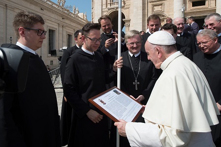 Höhepunkt waren die Generalaudienz am Petersplatz und die persönliche Begegnung mit Papst Franziskus. Dabei überreichten Abt Gerhard und Prior P. Maximilian dem Heiligen Vater ein zeitgenössisches Kunstwerk in Form eines Astkreuzes und den Katalog zur neuen Gotik-Ausstellung im Stift Admont. Papst Franziskus zeigte sich sehr erfreut über die Geschenke und bat die Mönche Admonts um ihr Gebet.