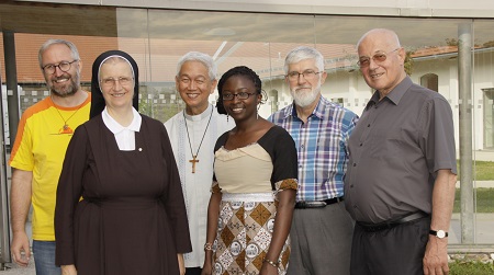 Foto v.l.n.r.: P. Franz Helm (Generalsekretär der Superiorenkonferenz der männlichen Orden Österreichs), Sr. Michaela Pfeiffer (Vereinigung der Frauenorden Österreichs), Bischof Broderick Pabillo (Präsident der Caritas in Manila), Monicah Wanjiru (Generalsekretärin der internationalen christlichen Arbeiterjugend, Kenia), Heinz Hödl (Geschäftsführer der Koordinierungsstelle (KOO)) und Abtpräses Christian Haidinger (Vorsitzender der Superiorenkonferenz der männlichen Orden Österreichs). (c) Ordensgemeinschaften Österreich/Manu Nitsch