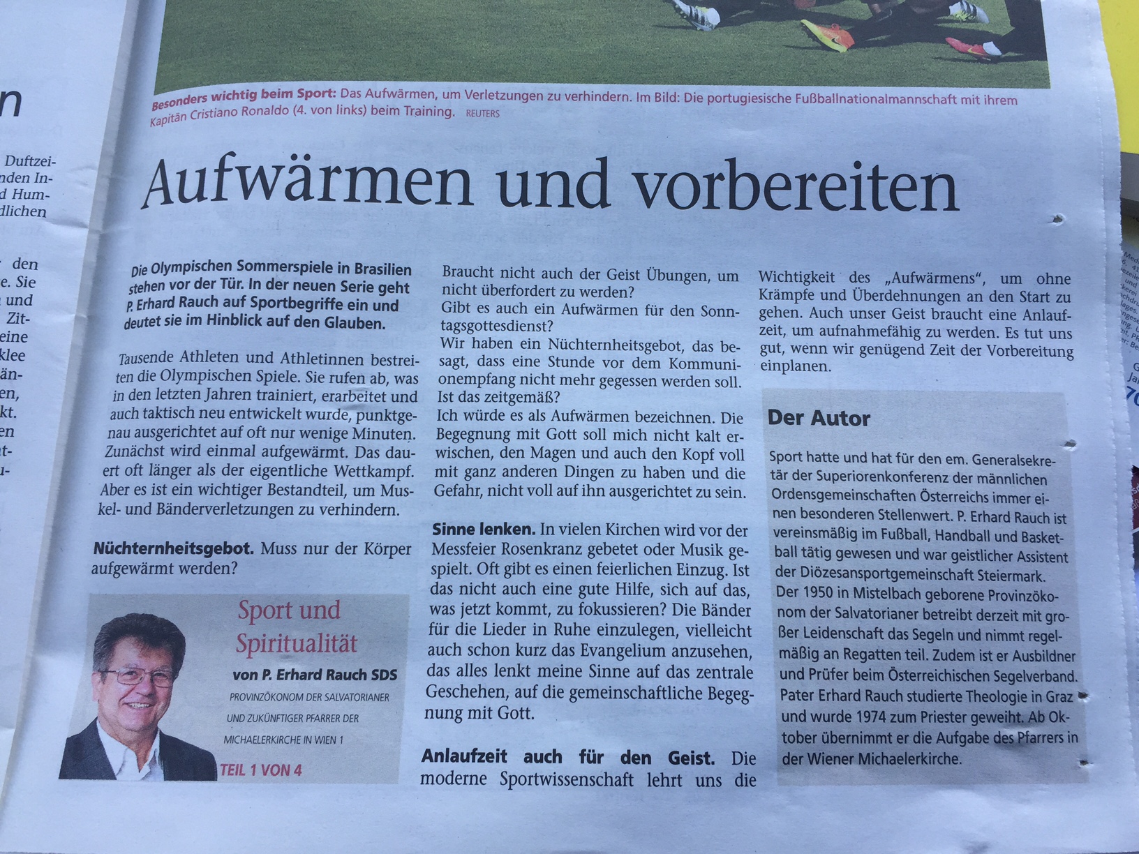 Dass der ehem. Generalsekretär der Superiorenkonferenz der männlichen Orden Österreichs, P. Erhard Rauch, leidenschaftlicher Sportler war und ist, ist hinlänglich bekannt. Jetzt schreibt der Salvatorianer und passionierte Segler für die Dauer der Olympischen Sommerspiele in Basilien (5. bis zum 21. August 2016) für österreichische Kirchenzeitungen eine Artikelserie über "Sport und Spiritualität". Er deutet darin Sportbegriffe in Hinblick auf den Glauben. Inhalt des ersten Teils: Die Wichtigkeit des "Aufwärmens".