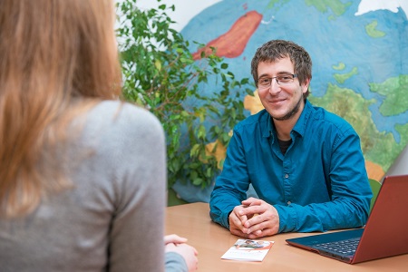 Bernhard Morawetz, Projektleiter von WeltWegWeiser, bei der Beratung von Freiwilligen © WeltWegWeiser