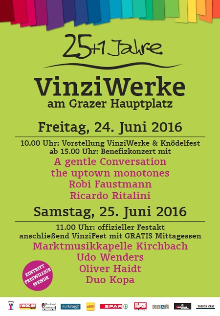 Das Festprogramm beginnt am Freitag, 24.06., um 10.00 Uhr und steht unter dem Motto „Gib uns deinen Knödel“. Musikalischer Hauptact sind "the uptown monotones". Der anschließende Samstag , 25.06., beginnt um 11.00 Uhr mit einem Festakt und sagt anschließend „Setz‘ di her do neben mir“. Um 12.00 Uhr gibt es beim VinziFest ein Gratis-Mittagessen. An beiden Tagen ist der Eintritt eine freiwillige Spende.