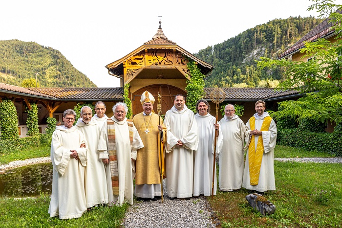 Die Mitbrüder des Europaklosters Gut Aich sowie Abtpräses Johannes Perkmann (5.v.l.) freuten sich mit Br. Wolfgang Schachner (4.v.r.). (c) Susanne Windischbauer