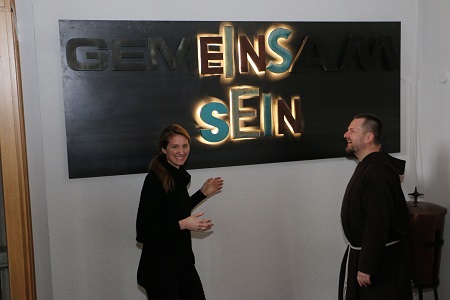 Karen Gleissner, künstlerische Grafikerin, und Br. Paul Borek, Hausoberer der Kapuziner, freuen sich über die Installation in der Kirche © Kapuziner
