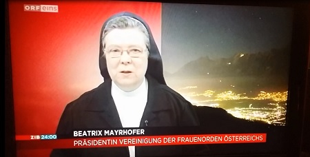 Am 10. März 2016 war Frauenorden-Präsidentin Sr. Beatrix Mayrhofer zu Gast in der ORF-Sendung ZIB 24. Im Mittelpunkt des Gespräches mit ZIB-Moderator Roman Rafreider stand die am Vortag veröffentlichte Stellungnahme für eine humanitäre Flüchtlingspolitik, die gemeinsam von einer Vielzahl von TheologInnen, Ordensleuten und kirchlichen EntscheidungsträgerInnen unterzeichnet worden war. Mayrhofers Botschaft: Zäune sind keine Lösung, denn jede und jeder ist unser Nächster. Die Frage sei vielmehr: Wer profitiert an dieser Situation?