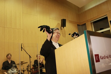 Präsidentin Sr. Beatrix Mayrhofer erinnerte daran, dass P. Erhard in seiner Jugend Torwart in einem Fußballverein gewesen sei. „Er steht auf dem Platz, an der richtigen Stelle, hochkonzentriert, er denkt mit, denkt sich in die Spielzüge hinein, liefert glänzende Paraden“ – so könne sie auch die Tätigkeit von P. Erhard als Generalsekretär beschreiben. „Bei uns hast du das 1er-Leiberl 14 Jahre lang getragen“, so Präsidentin Sr. Mayrhofer.