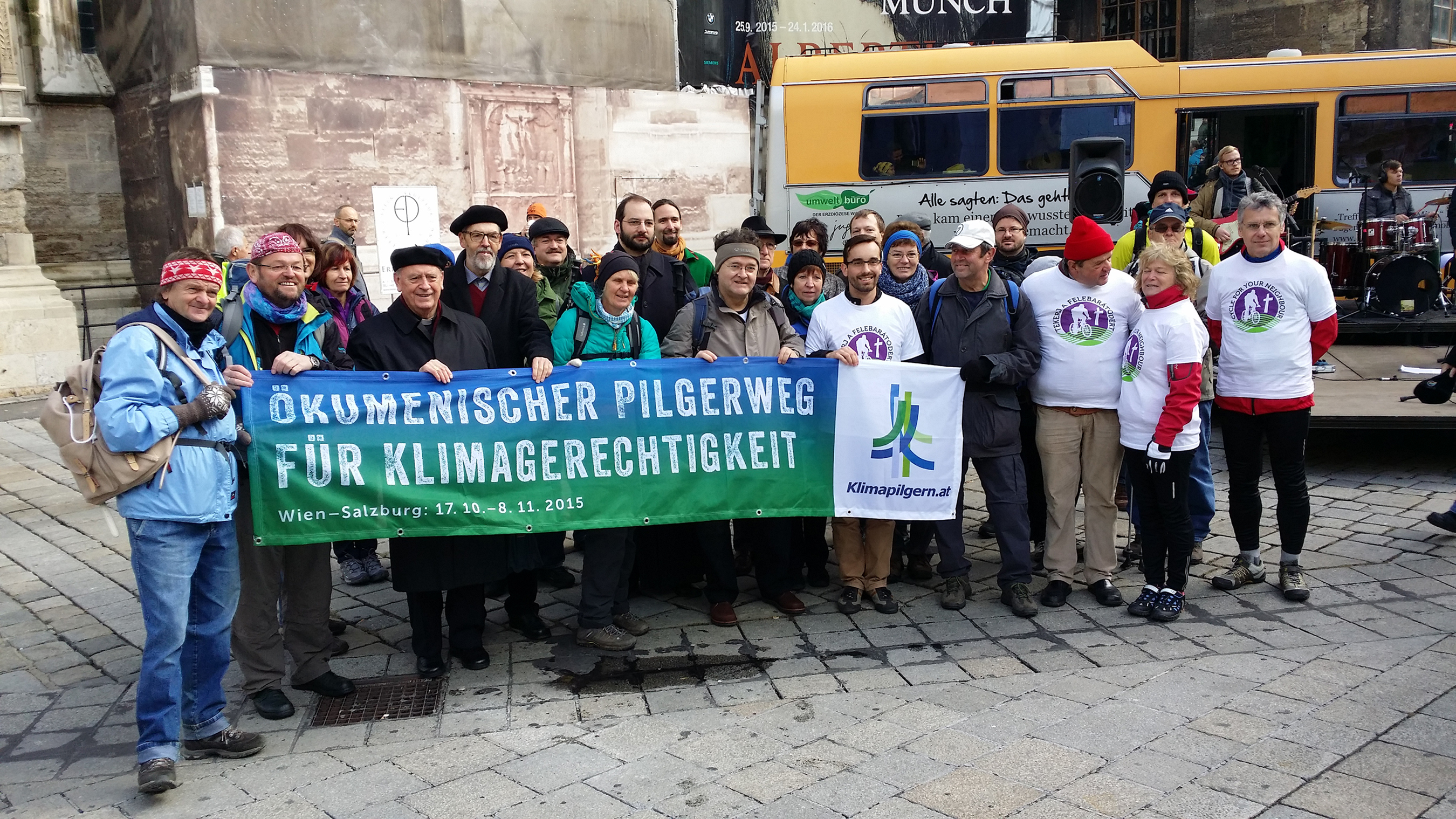 Bei überraschend sonnigem Herbstwetter starten heute Vormittag am Stephansplatz in Wien über 20 Pilgernde auf den Ökumenischen Pilgerweg für Klimagerechtigkeit. Die „Klimapilgernden“ aus mehreren christlichen Kirchen haben die Weltklimakonferenz in Paris im Dezember dieses Jahres als Ziel. In Österreich führt der Weg, welcher Teil einer internationalen Pilgerbewegung ist, zu Fuß in 22 Tagen von Wien bis Salzburg. Unterwegs werden die Pilgernden nach Kraftorten und Schmerzpunkten der Klimagerechtigkeit suchen und politische Entscheidungstragende eindringlich ermahnen, sich bei der Weltklimakonferenz in Paris auf wirksame und ausreichende Vereinbarungen zum Klimaschutz und zur Klimawandelanpassung zu einigen.